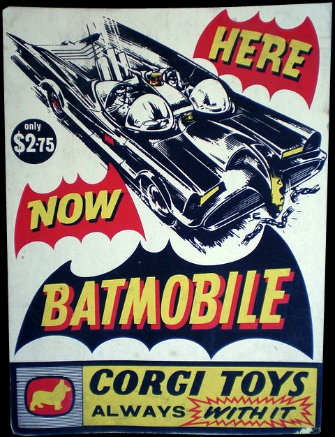 While surfing through YouTube the other night I came across this cool "Vintage Batman Toy Collecting" Video that features some wonderful Corgi Toys from the 60's and 1970's. Then, last night, I found this old CORGI TOYS 1966 BATMOBILE Store Display Advertising Sign, it's.. so... beautiful! Anyways, I thought these 2 items would go together nicely for a post to celebrate the super-awesomeness of Corgi! (Is "awesomeness" even a real word? I think I just made that up, ha! )